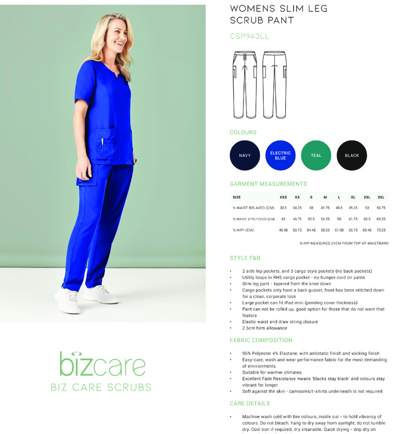 CSP943LL Bizcare Womens Slim Leg Scrubs Pant