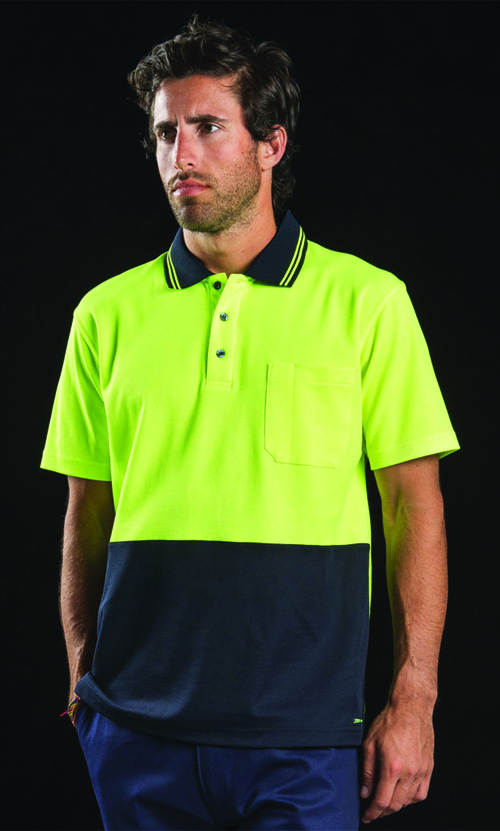 Details: Hi Vis Non Cuff S/Sleeve Polo JB's 6NCCS Short SleeveTraditional Look Cotton Back Polo, 55% Cotton 45% Polyester Blend, Open Sleeve, Contrast Stripe Collar, Quick Drying. UPF 50+Code 6NCCSColour Lime/Navy, Orange/NavySizes XS-5XL