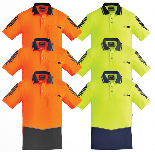 Unique Hi Vis compliant stretch mesh that runs down the side panel and sleeve for breathe ability in hot conditions, Moisture wicking, Quick dry, Contrast print on shoulder, Chest pocket.