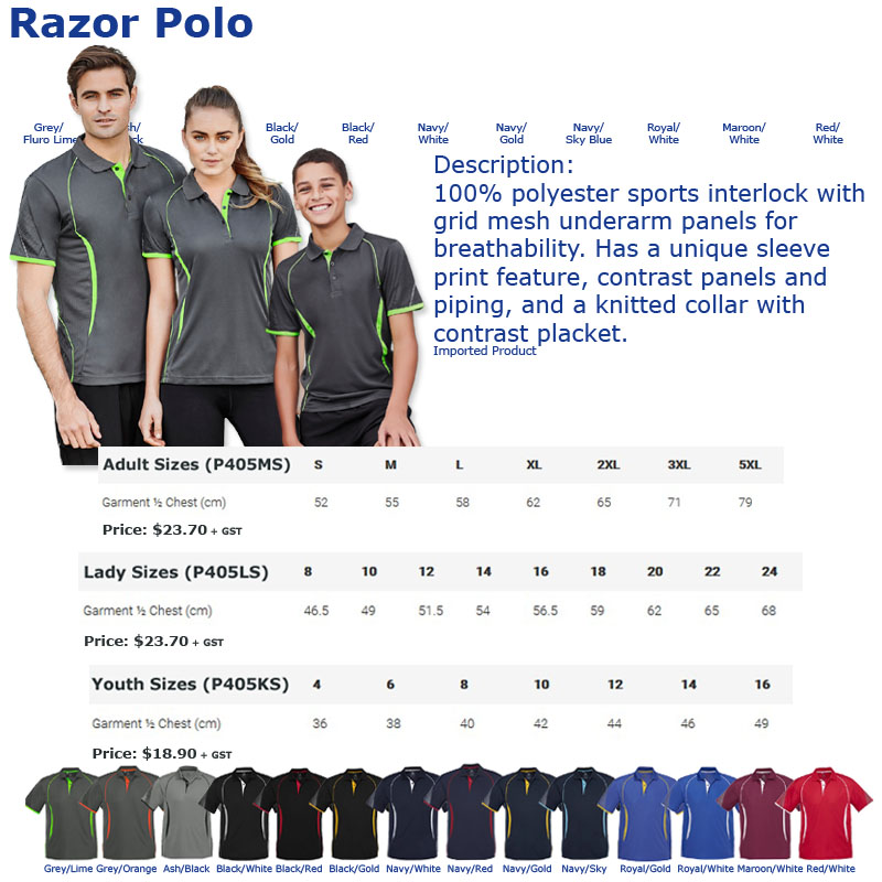 Polo Shirt Razor Biz Collection P405 Polyester Sports Interlock