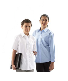 65% Polyester, 35% Cotton Poplin, Comfort Fit. Available Short and Long Sleeve.