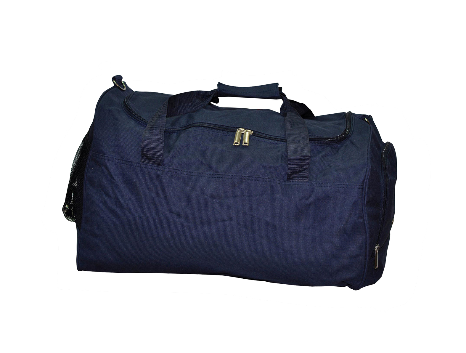 Features: U-shaped double zippered main compartment. Right side mesh pocket. Left side zipped shoe or wet items compartment with two gun metal eyelets outside pocket for ventilation.