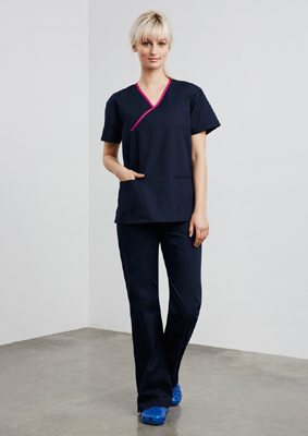 65% Polyester 35% Cotton, High Performance Soft Touch Fabric, Laundry Friendly, Crossover Feature with Contrast Trim, 2 Front Welt Pockets, Side Splits, Coordinates with Ladies Bootleg Pant.