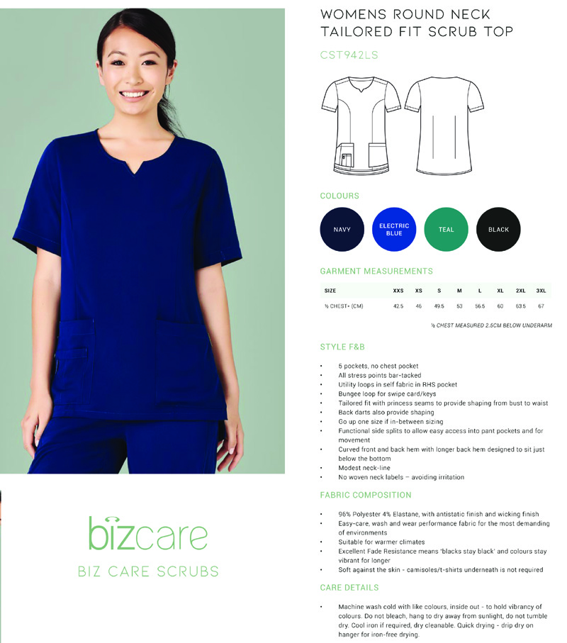 CST942LS Bizcare Womens Round Neck Tailored Fit Scrubs Top
