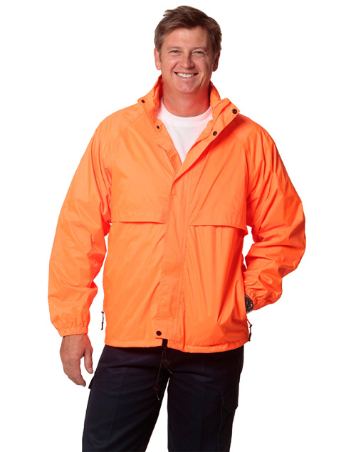 Nylon outer with PU coating, Polyester mesh lining, Waterproofed with heat sealed seams, Concealed hood with drawstrings, 2 Zippered side pockets, Bottom drawstring, Elasticised cuffs, Folds into a pouch bag.