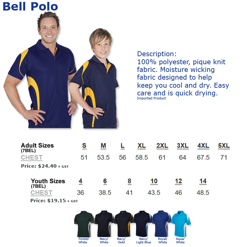 7BEL Bell Polo 100% Polyester Pique From $19.15 + GST