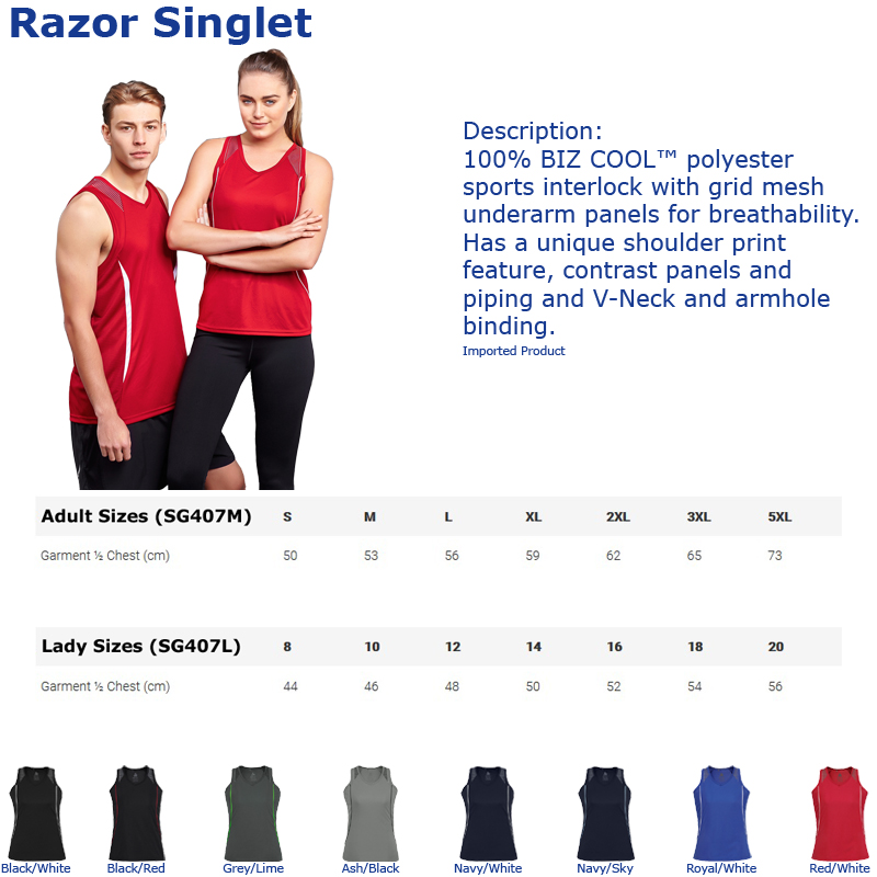Singlet Razor Biz Collection SG407 100% Polyester Sports Interlock