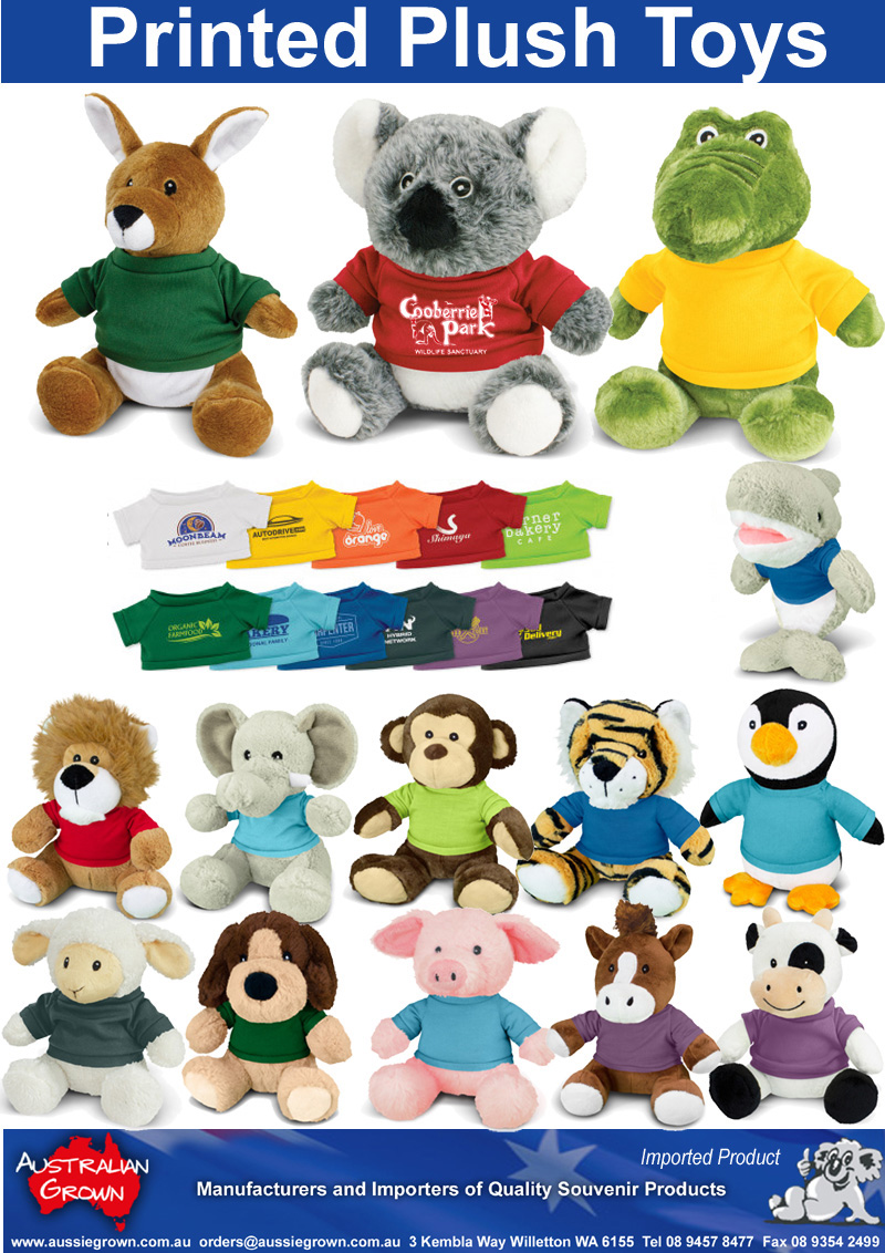 These plush toys have embroidered eyes and eleven colour options for the polyester t-shirt.