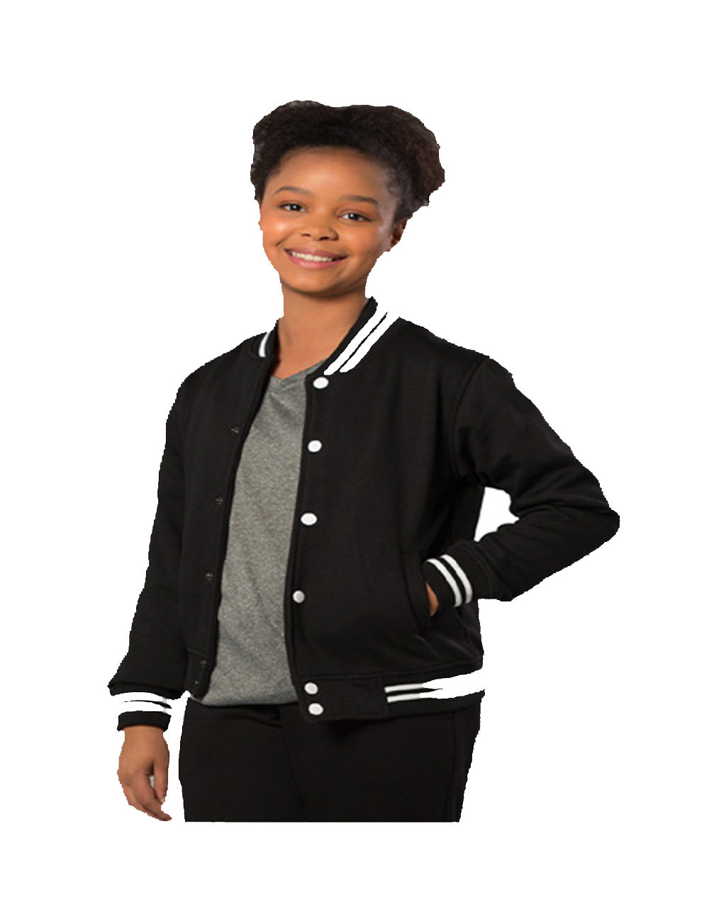 Description:Heavy ribbed collar, cuffs & waist band with contrast strips. Two front welt pockets. Press studs front closure.